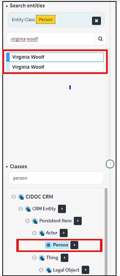 This panel is found on the left side of the screen of a Knowledge Map. The class Persons was selected in the Classes search section of this panel. This restricts the Search entities box to entities in the Persons class. Now when you search Virginia Woolf, you only get results where Virigina Woolf is a person (not related works, events, activities, etc.).