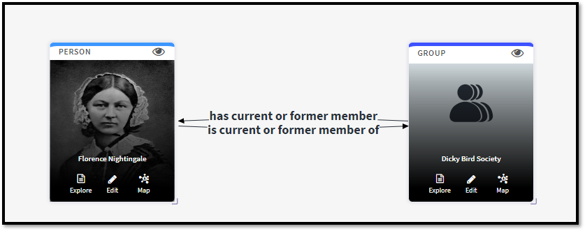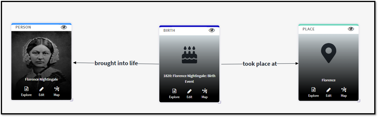 This Connections box shows some of the outgoing statements (is current or former member, is subject of, Same As, type) and incoming statements (refers to, was death of) for the person Florence Nightingale. Take note of the icons that represent incoming and outgoing statements.