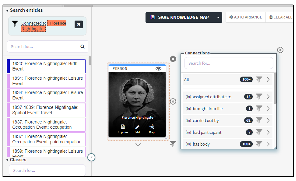 You can view all the incoming and outgoing statements connected to an entity within the Knowledge Map. The following image shows Florence Nightingale in a Knowledge Map and some of her associated connections.