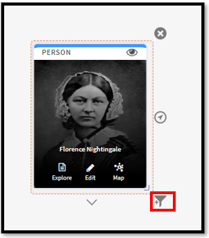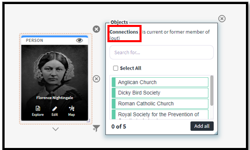 Open the connections panel to show the options for editing the links connected to the highlighted Entity Card, Florence Nightingale.