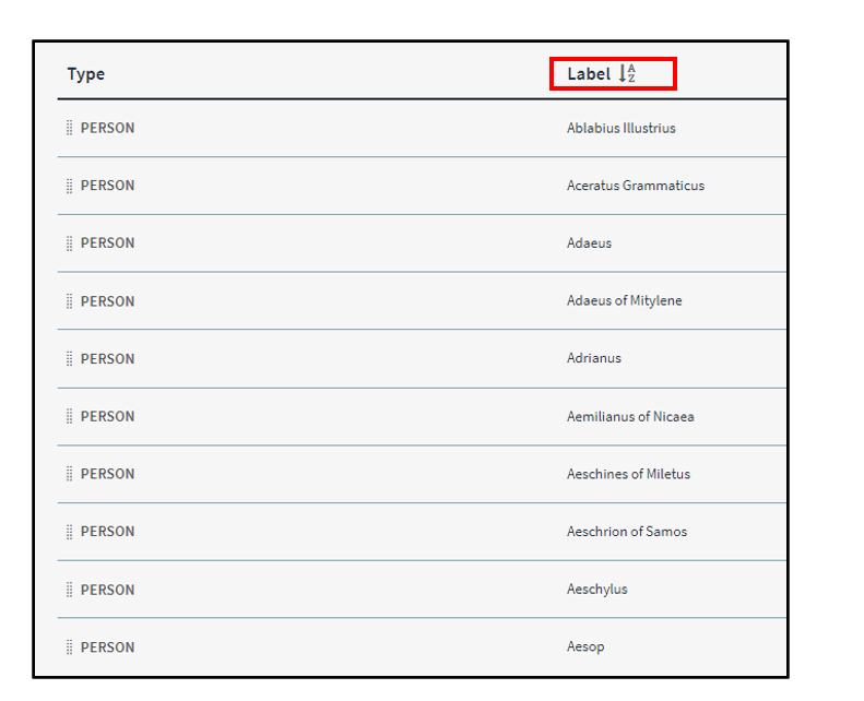 Below is an example of table view. Click on the table header to sort results alphabetically A-Z or Z-A.