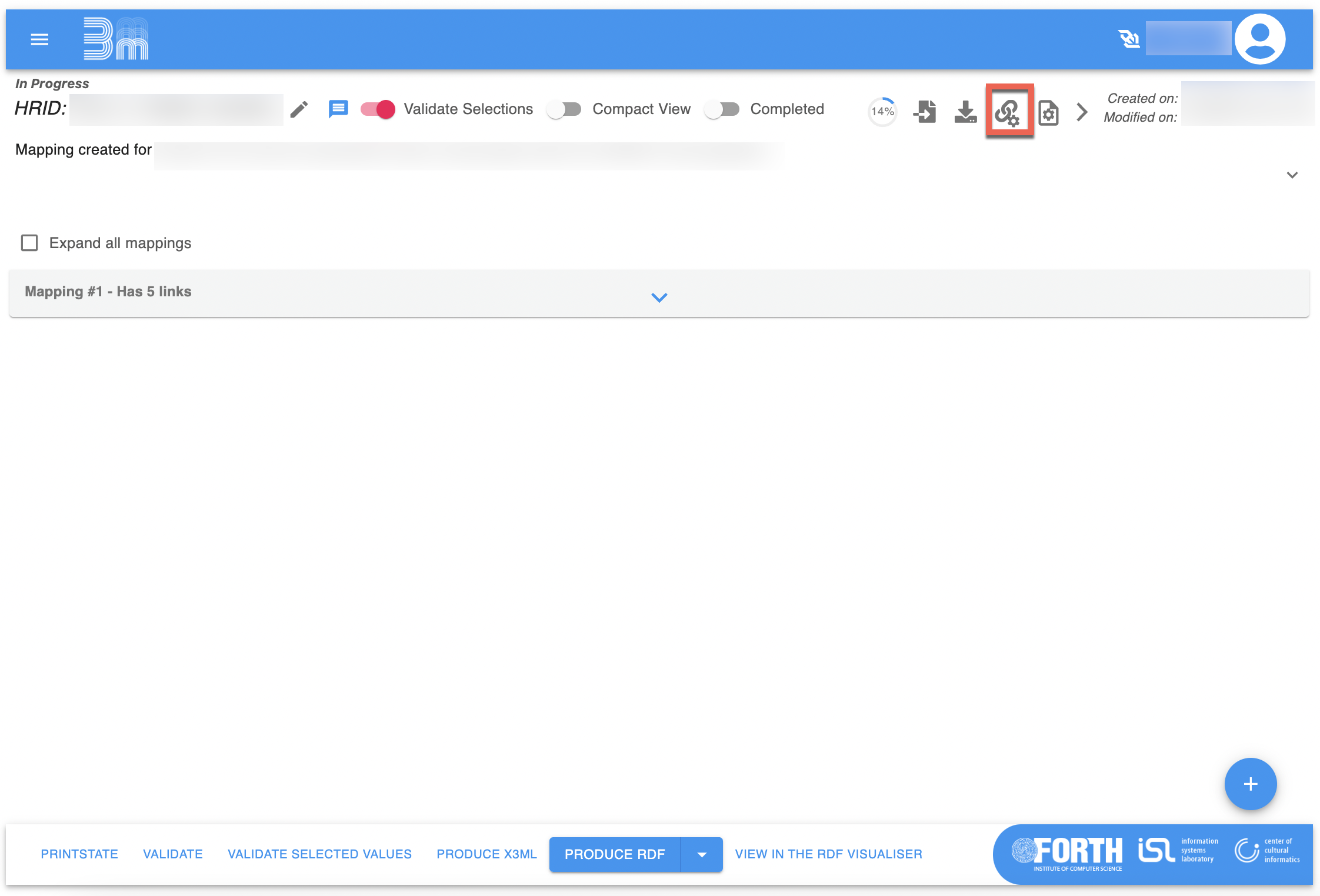 At the bottom of the Mappings Overview page is the Produce RDF button. The mapping project is automatically saved in the LINCS 3M instance. To get your transformed data out of 3M, you must produce RDF data.