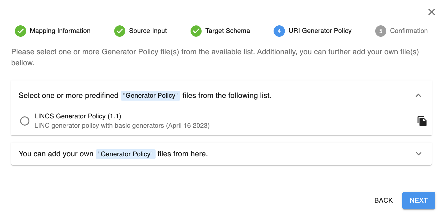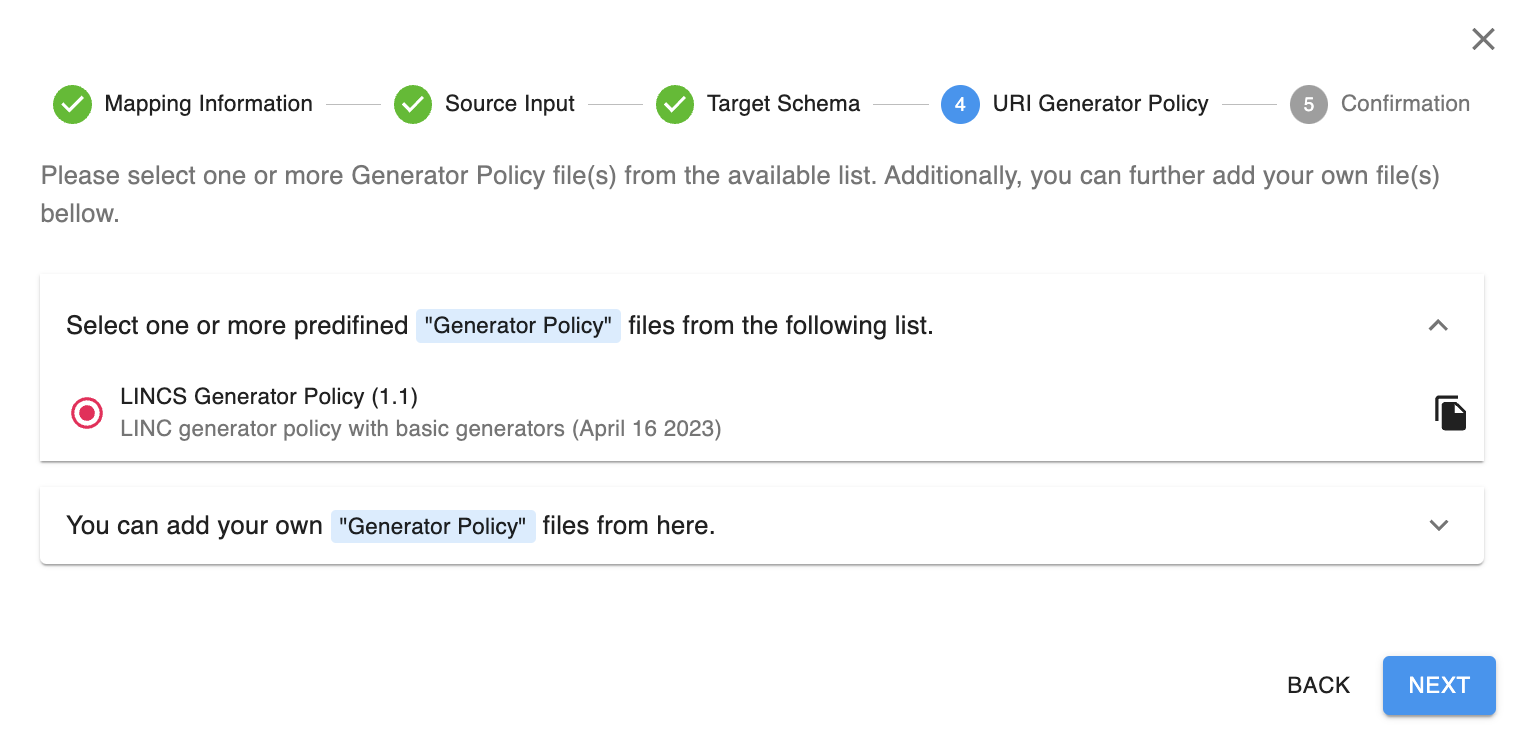 - Sélectionnez LINCS Generator Policy (1.1). Il s'agit de la politique relative aux générateurs de base utilisé par LINCS.